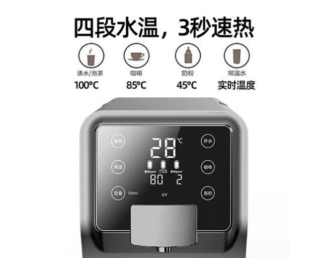 2、四檔可調溫速熱系統,4種溫度選擇,即時滿足各種飲水需求(25℃直接喝;45℃沖泡奶粉;85℃沖泡咖啡;99℃沖泡茗茶,同時無熱膽設計,即熱即飲,杜絕千滾水;