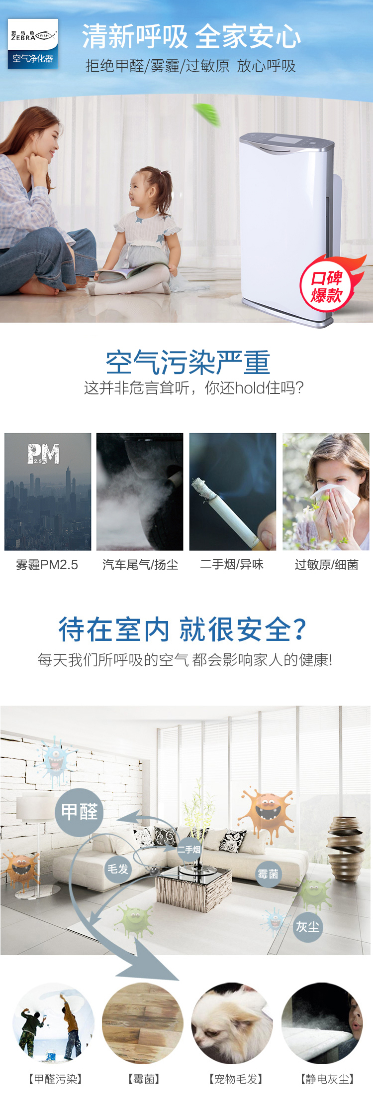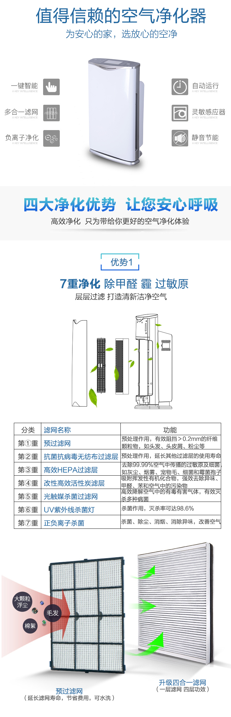 1、七重過濾系統,有效清除空氣中的PM2.5、甲醛、病菌等;