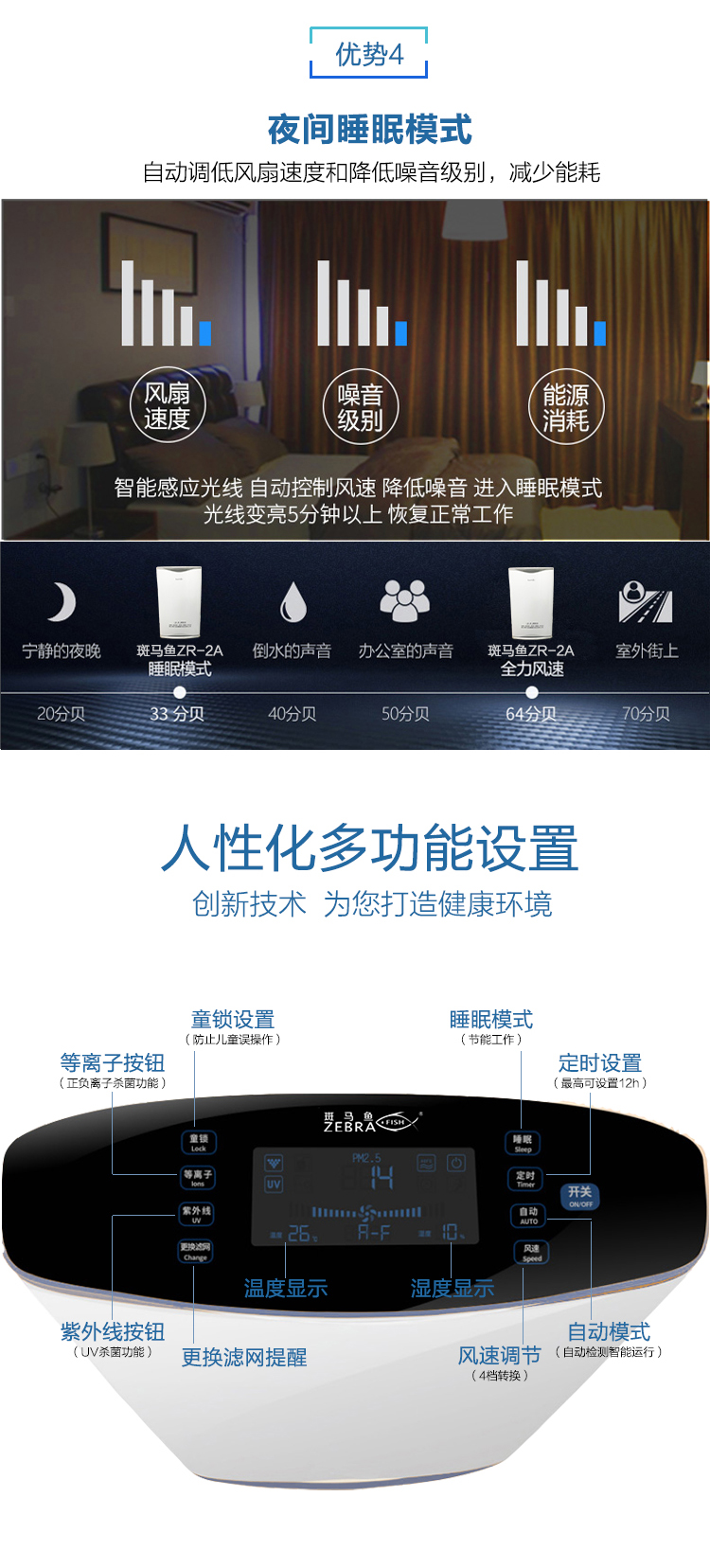 4、光感系統:當機器感應到外界光線變暗,即使用者睡眠時,機器自動進入睡眠模式,噪音值降到最低;